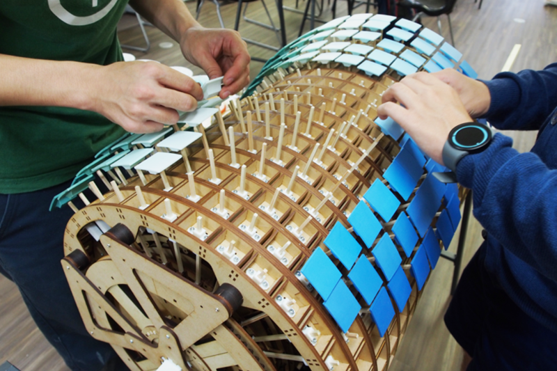 作品は多数のパーツを組み合わせて構成されており、レーザーカッターによるMDFの加工や3Dプリンタによるパーツの出力など、デジタル工作機械を活用して制作されています。完成した構造体にはコーンウォールの海の色彩を再現したパネルが取り付けられ、海のグラデーションや波のイメージが表現されています。