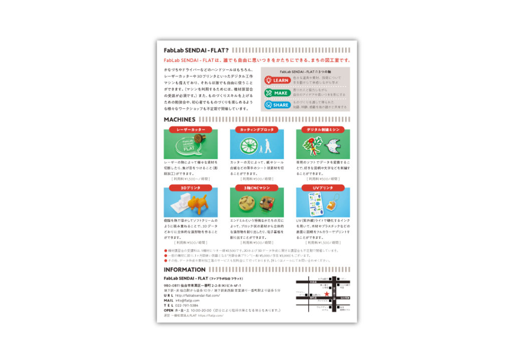FLATが運営する「FabLab SENDAI – FLAT」のチラシデザインを行いました。