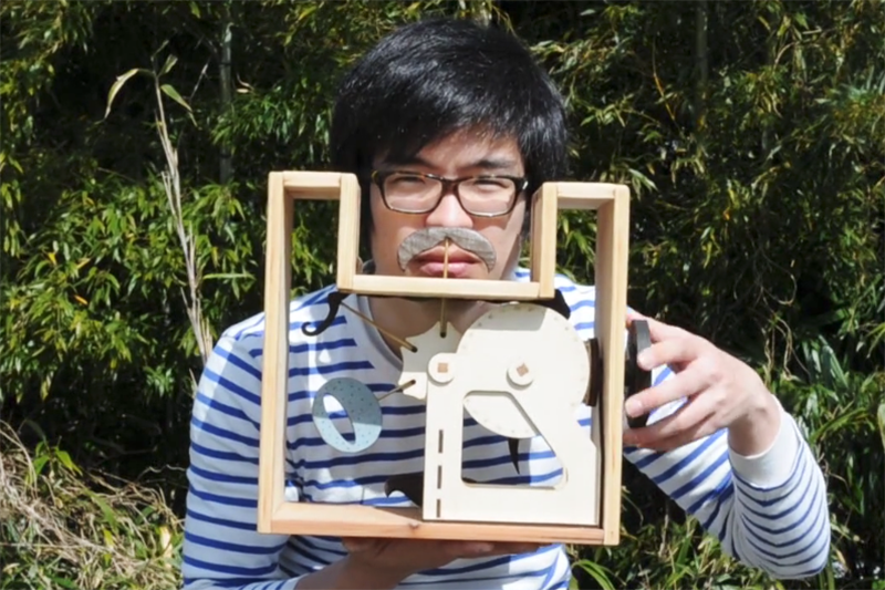 回転運動をカム機構によって変換し、ハンドルを回すことでヒゲのパーツが動く仕組みになっています。