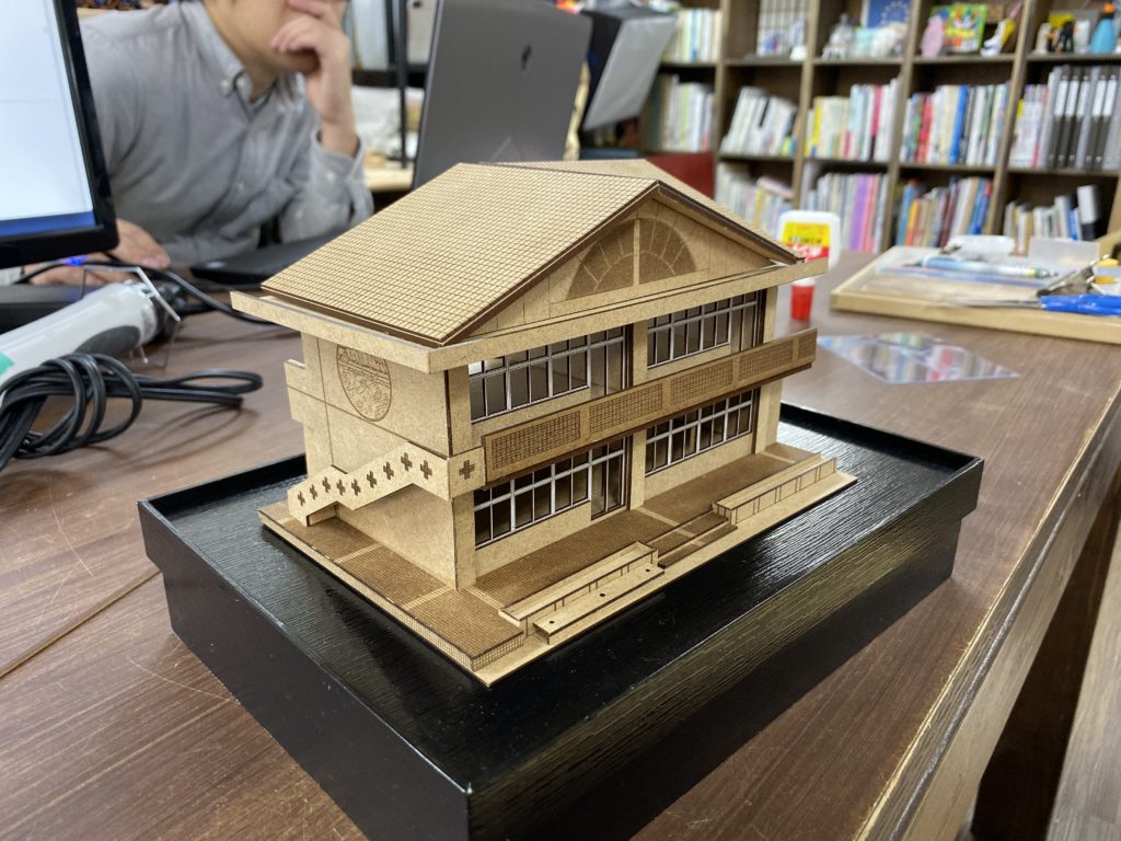 模型はMDF(中密度繊維板)をベースに制作し、屋根の質感や床タイルなどのテクスチャはレーザー加工によって表現。窓サッシなどの細部はUVプリンタによるホワイトインク印刷を用いることで、繊細なディテールを再現しました。